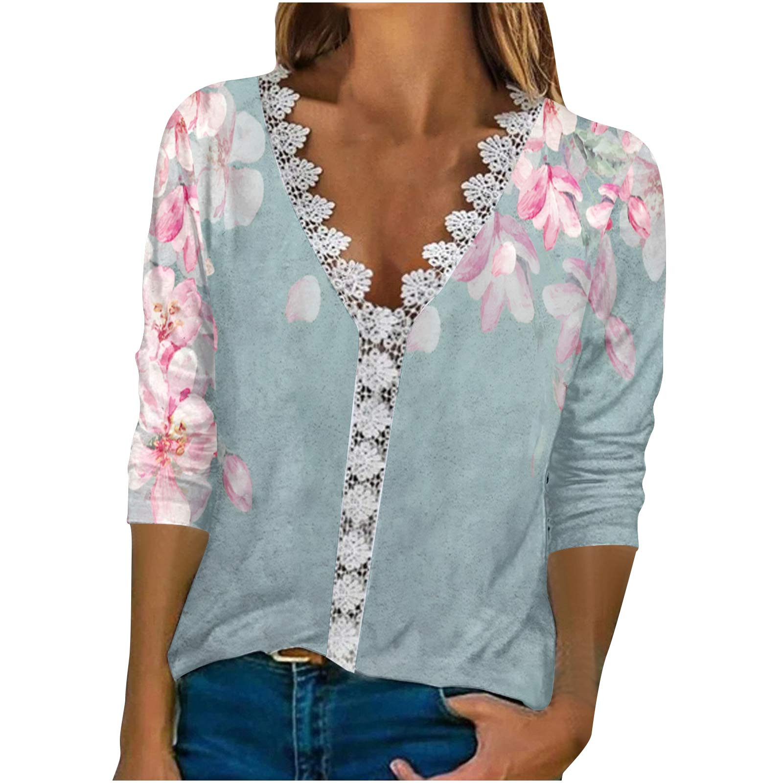 Cobkk Sexy Tops For Women Round Neck Blouses Shirts Women S Fashion Printed Lace Three Quarter Seeves Blouse V Neck Casual Tops Holiday Tops For Women Casual Athletic Formal Dressy Shirts Light Blue Walmart Com